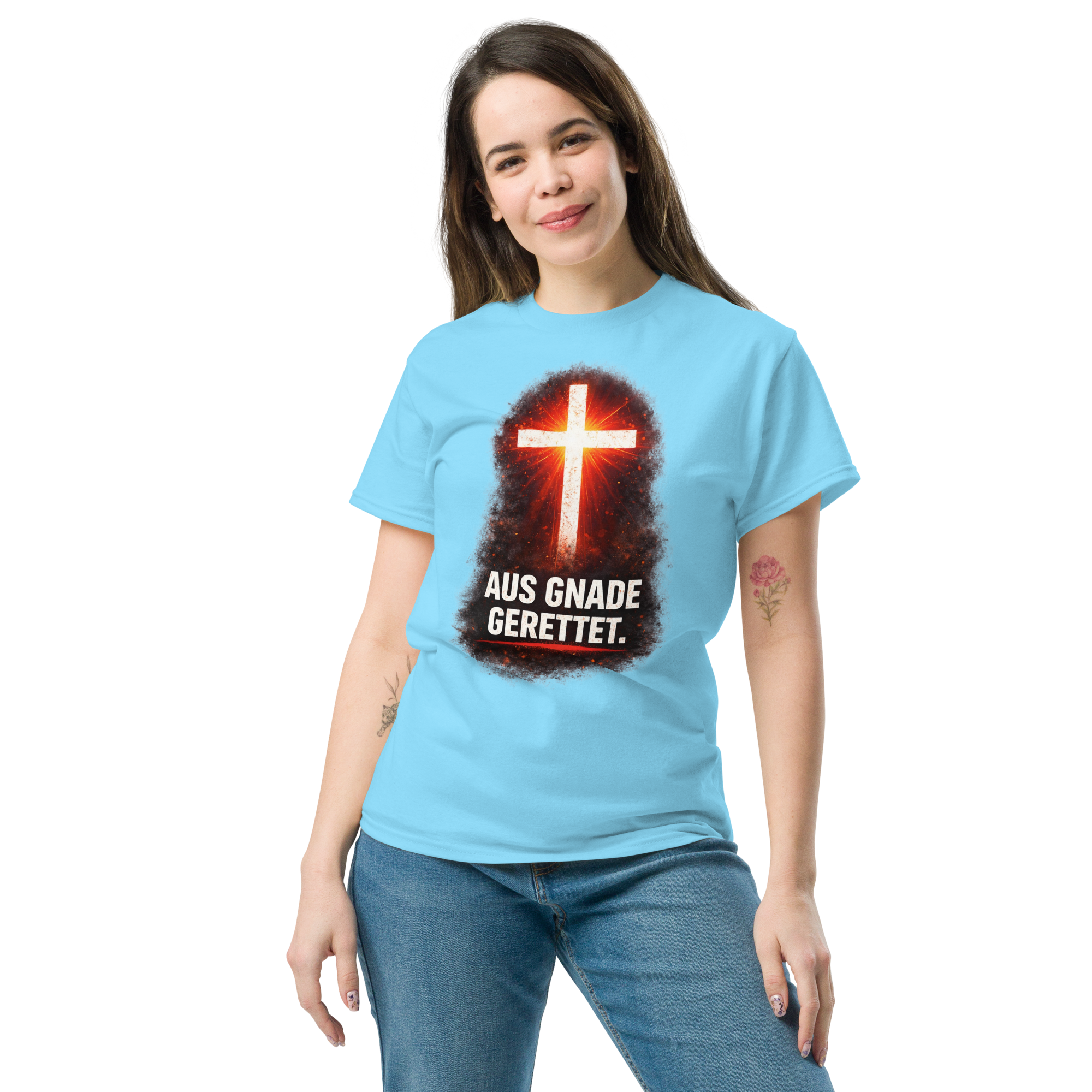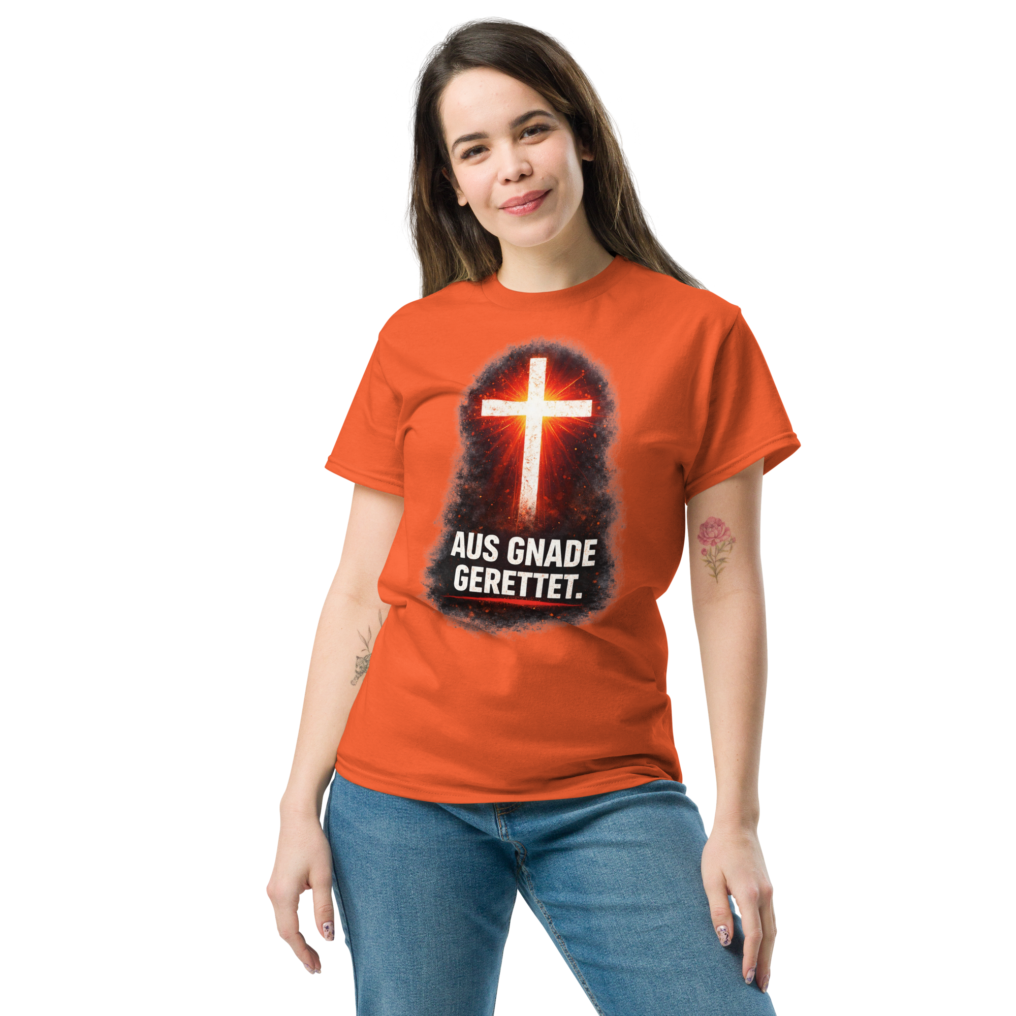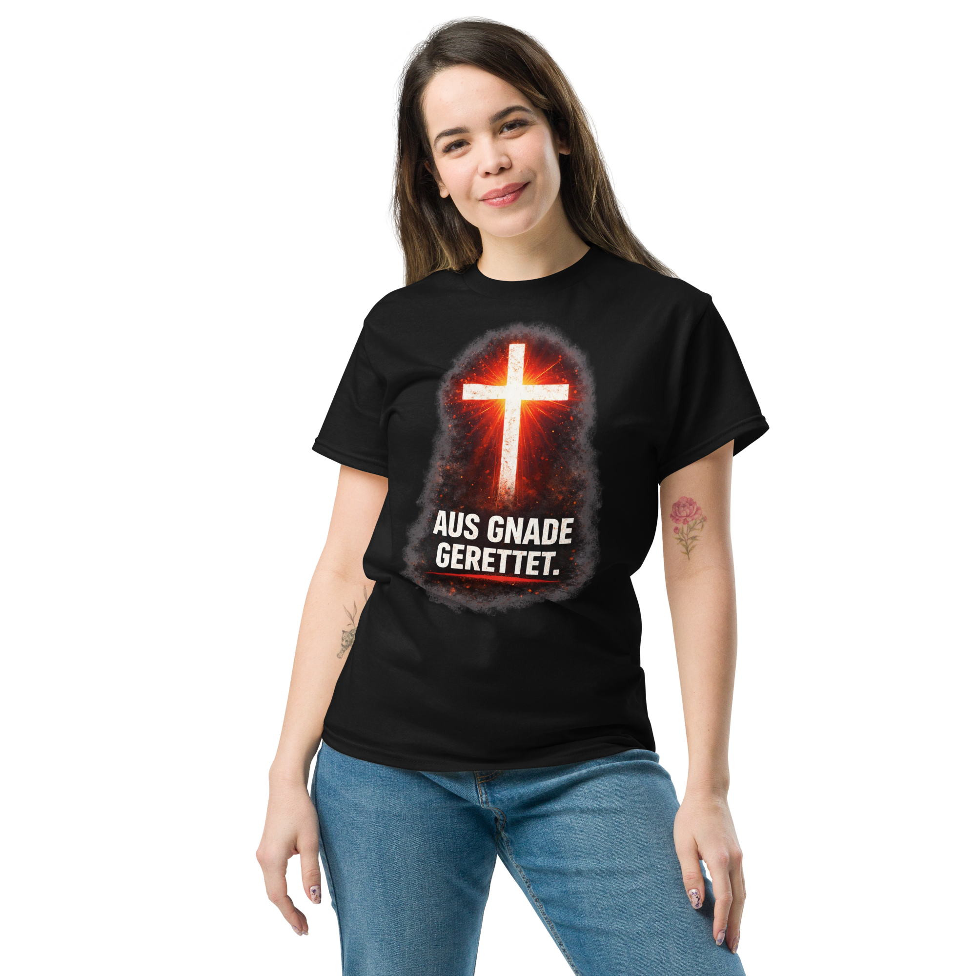 Das klassische Unisex-T-Shirt aus 100 % Baumwolle sorgt für eine gerade Linie. Es sitzt schön, behält klare Linien an den Kanten und passt perfekt zu mehrschichtigen Streetwear-Outfits. Außerdem ist es jetzt besonders im Trend!
